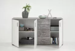 Suuressa Albi 3 senkissä on miellyttävän paljon käytännöllistä säilytystilaa! Albi senkki on käytännöllisen suurikokoinen senkki, josta löytyy reilusti säilytystilaa. Kaappien lisäksi senkistä löytyy neljä metallikiskoilla olevaa laatikkoa. Albi senkin runko ja laatikoiden edustat ovat harmaan väriset ja kuvioitu ikään kuin betonin näköiseksi, mikä antaa senkille tyylikkään rosoisen ulkonäön valkoisen kaapin ovien tuodessa samalla sopivasti raikkautta senkkiin. Vetiminä Albi senkissä on tyylikkään kapeat ja ohuet hopeanväriset vetimet. Suoraviivaisuutensa ja väriensä vuoksi Albi senkki on helposti yhdisteltävissä monenlaisiin sisustuksiin. Tilaa nyt Albi senkki todella edulliseen hintaan verkkokaupastamme! Tekniset tiedot: Väri: Betoni/valkoinen Kapeat hopean väriset vetimet Laatikoissa laadukkaat metallikiskot Valmistettu kalustelevystä Toimitetaan osina Senkin mitat: Senkin mitat: leveys: 160 cm, syvyys 35 cm ja korkeus 83 cm Albi senkin kasausohje