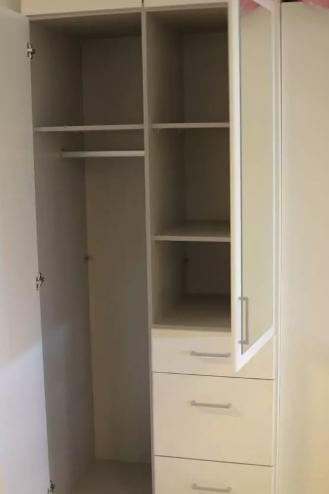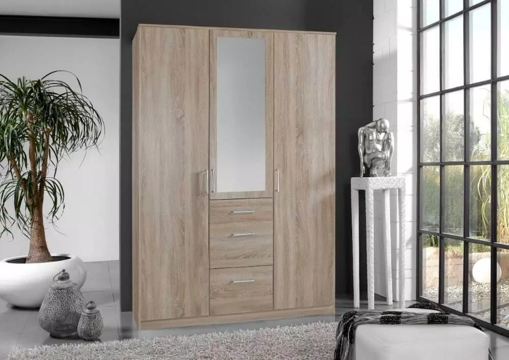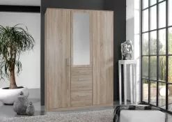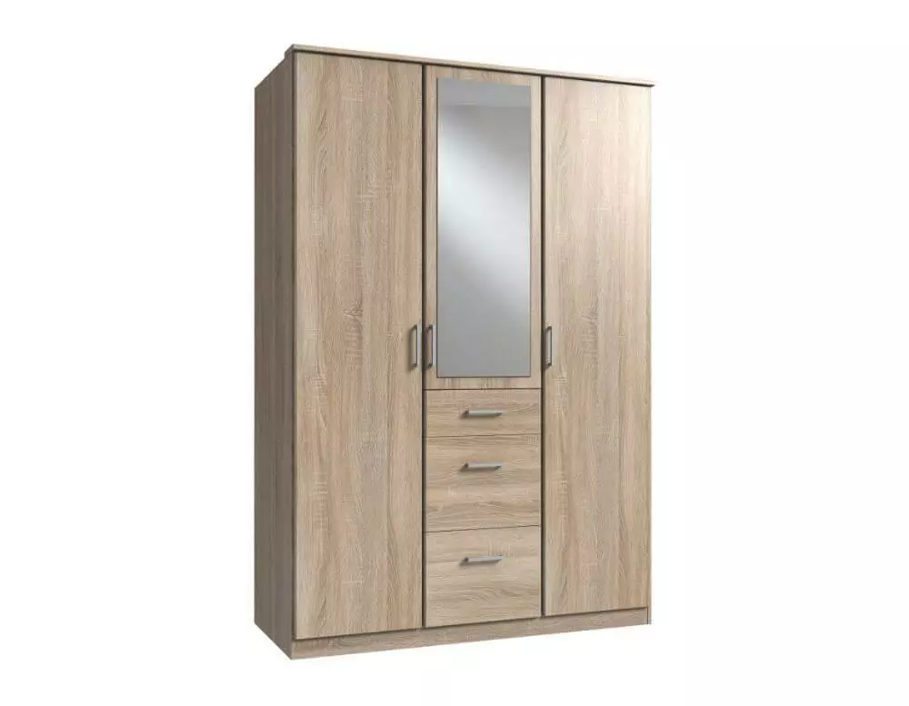 Tyylikkäässä Click vaatekaapissa on runsaasti säilytystilaa! Click vaatekaappi on oikea valinta runsaan säilytystilan etsijälle. Vaatekaappi on saatavana 3-osaisena tai 2-osaisena sekä yläkomerolla tai ilman. 3-osaisessa molempien reunimmaisten ja 2-osaisessa reunimmaisen oven takaa löytyy vaatetanko ja ylähylly. Vaatekaapin peilioven takana on kolme säilytyshyllyä. Peilioven alapuolelta löytyy kolme tilavaa laatikkoa, joissa on helppo säilyttää esimerkiksi pienempiä vaatteita tai tavaroita. Värivaihtoehtoina tässä edullisessa vaatekaapissa ovat trendikäs duntetammi ja perinteisen tyylikäs valkoinen. Tekniset tiedot: Vaatekaapin väri: duntetammi Saranaovet sekä ala- että yläkaapissa Saatavana yläkomerolla tai ilman Yläkomero löytyy täältä Saatavana 3-osaisena sekä 2-osaisena Valmistettu kalustelevystä Toimitetaan osina paketissa Helppo kasata suoraan pystyasentoon Vaatekaappiin saatavana myös lisähyllyjä. 3-ovisessa kaikkiin osioihin sopii tämän lisähyllyn kapeampi versio. Vaatekaapin mitat: 3-osainen: leveys 135 cm syvyys 59 cm korkeus 199 cm yläosan listan kanssa (ilman listaa 197 cm) 2-osainen: leveys 90 cm syvyys 59 cm korkeus 199 cm yläosan listan kanssa (ilman listaa 197 cm) Peilin mitat: leveys 34,5 cm ja korkeus 101 cm