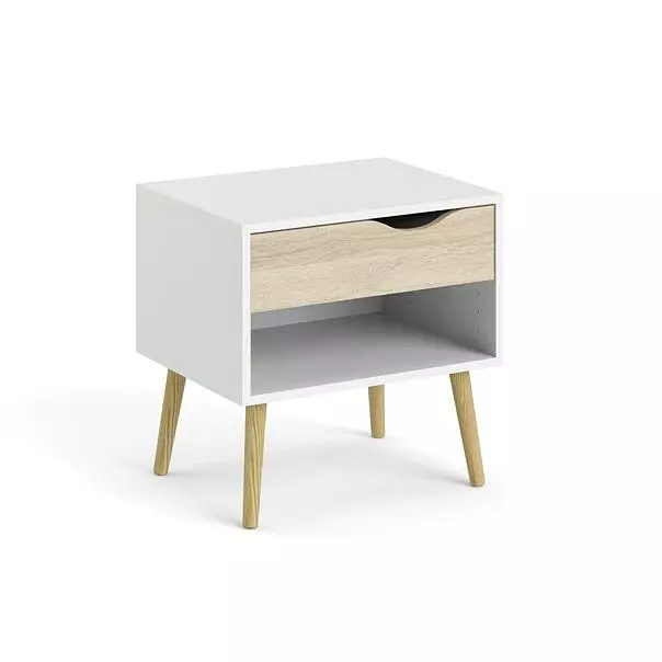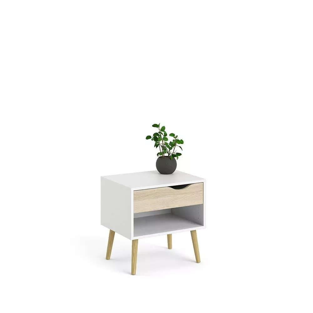 Kauniit Delta yöpöydät sopivat niin moderniin kuin retrohenkiseenkin sisustukseen! Delta yöpöytä on retrohenkinen yöpöytä, jossa on tyylikkäät korkeat duntetammen väriset jalat. Kaksivärisen yöpöydän runko on kokonaan valkoinen, kun taas kontrastia tuomassa laatikon edusta ja korkeat jalat ovat duntetammen väriset, mikä tuo tyylikkyyttä yöpöytään. Delta yöpöytä on valmistettu pinnoitetusta kalustelevystä ja jalat ovat kestävää tammea. Yöpöydässä on yksi säilytyslaatikko, jossa on laakeroidut kiskot eli laatikko on kestävä ja liikkuu hyvin kevyesti. Tekniset tiedot: Väri: valkoinen/duntetammi Materiaali: pinnoitettu kalustelevy Jalat tammea Laatikossa laakeroidut kiskot Retrohenkinen yöpöytä Yöpöydän mitat: Yöpöydän mitat: leveys: 50,2 cm, syvyys 39,1 cm ja korkeus 49,7 cm Jalkojen korkeus 20 cm Avo-osien sisäleveys 47 cm Avo-osien sisäsyvyys 33,3 cm Avo-osien sisäkorkeus 13,2 cm Laatikon sisäleveys 43,7 cm Laatikon sisäsyvyys 33,1 cm Laatikon sisäkorkeus 7,5 cm laatikon reunaan Delta yöpöydän kasausohje ja kantavuustiedot