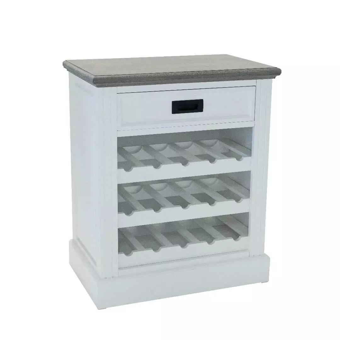 Elisabeth pullotelineessä säilytät esimerkiksi viinapulloja kauniisti! Kooltaan sirokokoinen Elisabeth lipasto/pulloteline ei vaadi suurta tilaa kapeutensa ansiosta, mutta silti siinä mahtuu säilyttämään jopa 15 pulloa. Elisabeth lipasto/pullotelineen runko on kokonaan valkoinen, ja sen kansi on petsattu eläväisen harmaaksi, joten lipasto sopii mainiosti esimerkiksi skandinaaviseen sisustukseen. Elisabeth sarjan huonekalut toimitetaan valmiiksi kasattuina, joten ne voi ottaa käyttöön nopeasti ja vaivattomasti! Tilaa nyt Elisabeth lipasto/pulloteline verkkokaupastamme ja kotiinkuljetamme sen ulko-ovellesi erittäin edulliseen hintaan! Tekniset tiedot: Valkoinen runko ja harmaa eläväpintainen petsattu kansi Yksi laatikko Laatikossa perinteiset puu/vanerikiskot Telineessä tilaa 15 pullolle Musta vedin Valmistettu mdf-levystä. Kansi puuviilua, kannen reunoissa puulistat Toimitetaan kasattuna! Lipasto/pullotelineen mitat: Leveys 65 cm, syvyys 40 cm ja korkeus 78 cm