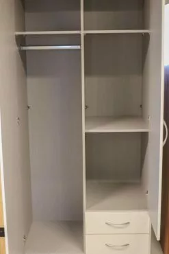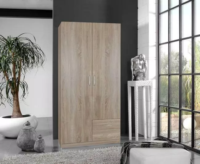 Floora 208 vaatekaappi sopii hieman pienempäänkin eteistilaan ja makuuhuoneeseen! Floora vaatekomero on kokonaan duntetammen värinen. Hillityn ulkonäön lisäksi vaatekaapin etuna toimii sen runsas säilytystila. Oikean puoleisen oven takaa löytyy tanko ja ylähylly, kun taas vasemman oven takana on kaksi välihyllyä. Komeron kummallakin puolella on kuitenkin valmiiksi myös reiät mahdollisille lisähyllyille. Tämän lisäksi komeron toiselta puolelta alaosasta löytyy vielä kaksi sopivan kokoista laatikkoa, joissa on helppo säilyttää esimerkiksi pienempiä vaatekappaleita. Mikäli komeroonsa haluaa enemmän hyllytilaa tankojen sijaan, on siihen mahdollista asentaa myös lisähyllyjä. Tekniset tiedot: Väri: duntetammi Vasemmalla puolella tanko ja ylähylly, oikealla puolella kaksi välihyllyä. Komerossa myös kaksi laatikkoa oikean puolen alareunassa Valmistettu kalustelevystä Valmistettu Saksassa Toimitetaan osina paketissa Helppo kasata suoraan pystyasentoon Vaatekaapin mitat: Leveys 90 cm, syvyys 58 cm ja korkeus 197 cm