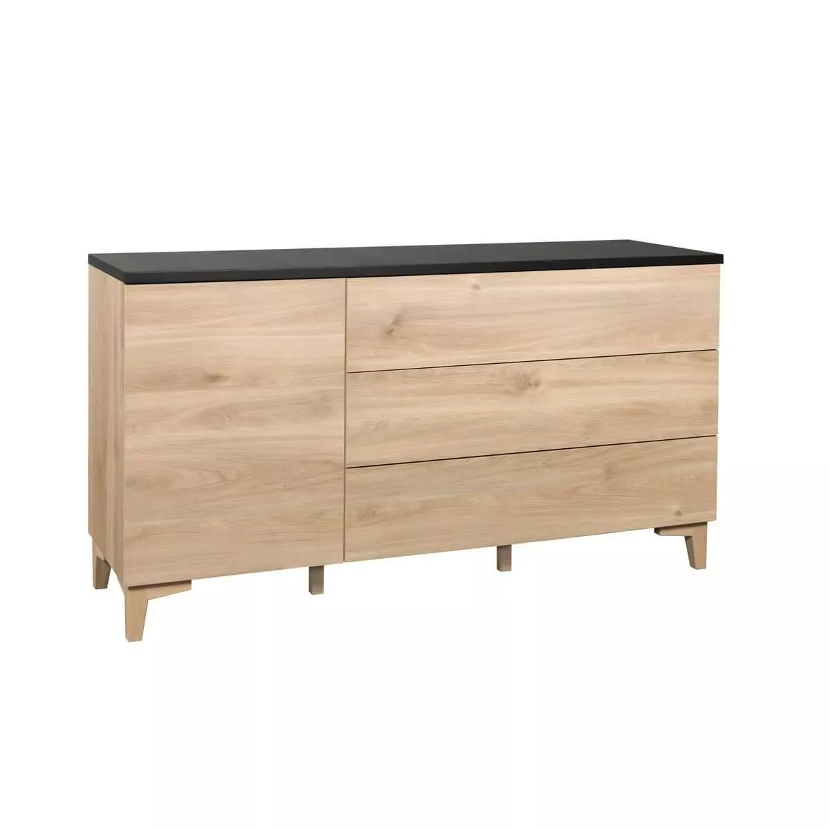Monikäyttöinen Niklas senkki on valmistettu Suomessa! Niklas senkki on sekä erittäin kaunis että monikäyttöinen valinta kotiin. Senkissä on paljon säilytystilaa, koska siinä on yksi kaappi ja kolme laatikkoa. Kaapin sisälle voi sijoittaa isompia tavaroita ja laatikoihin hieman pienempiä. Laatikot ja ovet sulkeutuvat turvallisesti hidastusmekanismin ansiosta, joten Niklas senkki on hyvä valinta esimerkiksi lapsiperheille. Näyttävän senkistä tekee sen hunajatammen värinen runko sekä maalattu musta tai tamminen kansi. Senkissä on myös tyylikkään korkeat jalat, jotka antavat tuotteelle ilmavuutta. Lisäksi korkeat jalat tekevät senkin alta siivoamisesta helppoa ja nopeaa. Niklas senkki on osa Niklas-tuoteperhettä, joka koostuu useista lipastoista, senkeistä, vitriineistä ja tv-tasoista. Esimerkiksi olohuoneen voi siis sisustaa kätevästi Niklas-tuoteperheen tuotteilla ja saada siten luotua kotiin yhtenäisen kokonaisuuden. Useilla Niklas tuotteilla kotiin muodostuu myös upean luonnollinen, mutta silti kauniin moderni sisustus. Kestävyyden tuotteille takaavat kotimaisuus ja laadukkaat valmistusmateriaalit. Tilaa Niklas N3.3 senkki 150 cm laatikot + umpiovet edullisesti verkkokaupastamme, ja me toimitamme senkin halutessasi ulko-ovelle saakka! Tekniset tiedot: Rungon väri: hunajatammi Kannen värivaihtoehdot: maalattu musta tai hunajatammi Runko ja etusarjat MFC-kalustelevyä Kansilevy maalattua MDF-levyä Jalat massiivipuuta Ovissa ja laatikoissa hidastusmekanismit, eli ne sulkeutuvat kevyesti ja hitaasti loppuun saakka Laatikoissa metalliset mikroliukukiskot Toimitetaan valmiiksi koottuna Kotimainen Senkin mitat: Leveys 150 cm, syvyys 49 cm ja korkeus 81 cm Jalkojen korkeus 13 cm Laatu: Hiipakan Pohjanmaalla valmistamat huonekalut ovat todella laadukkaita ja kestäviä. Materiaalit ovat hyviä ja tuotteet vankkoja sekä tukevia. Laatikoiden metallikiskot ovat hyvin toimivat ja helposti liukuvat. Niklas jalkasarja kiinnitysohje
