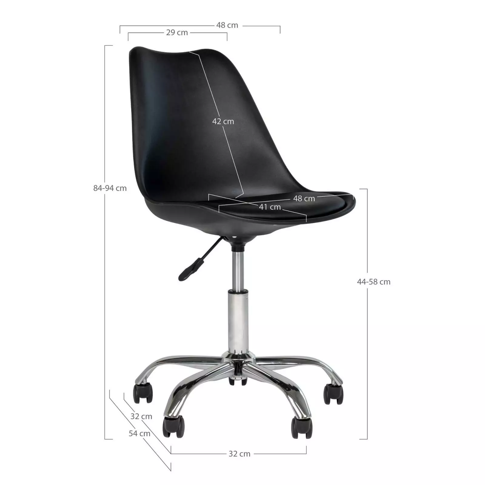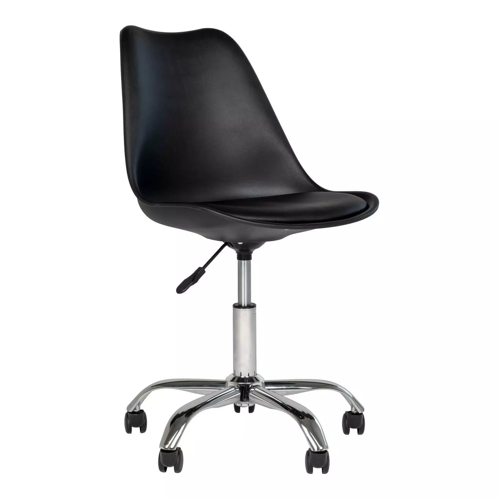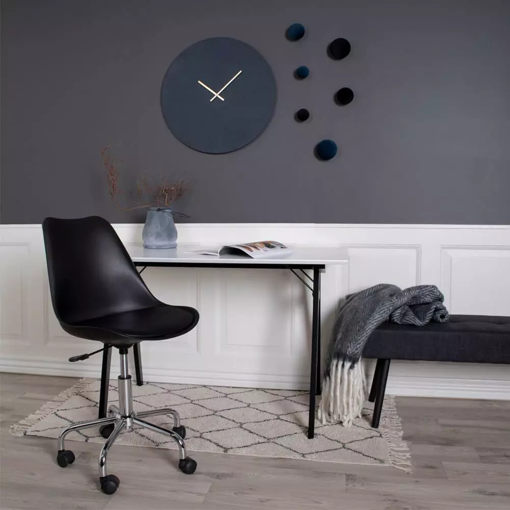 Stavanger työtuolissa yhdistyy tyylikkyys ja miellyttävä istuinmukavuus! House Nordicin Stavanger työtuoli on loistava valinta kun etsit tyylikästä ja mukavaa työtuolia. Tuolin istuinosa on päällystetty PU-keinonahalla, joten tuoli on myös helppo pitää puhtaana. Työtuoli sopii niin työhuoneeseen, kotitoimistoon kuin nuorten huoneeseen. Väriltään musta työtuoli sopii monen eri työpöydän kanssa yhteen. Tuolin korkeutta voi myös kätevästi säätää haluttuun korkeuteen. Tuolin alla on myös pyörät, joten tuolia on erittäin helppo siirtää. Tee työtilasta viihtyisä ja käytännöllinen tämän tyylikkään House Nordicin Stavanger tuolin avulla, ja tilaa se edullisesti verkkokaupastamme! Tekniset tiedot: Väri: musta Materiaali: Pu-nahka ja kromi Muovikuori Korkeus säädettävissä kaasujousella Helppohoitoinen verhoilumateriaali Toimitetaan osina Työtuolin mitat: Leveys 48 cm, syvyys 54 cm ja korkeus 84-94 cm Stavanger työtuolin kasausohje