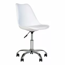 House Nordicin Stavanger on kaunis ja upeasti muotoiltu työtuoli! House Nordicin Stavanger työtuoli tuo tyylikkyyttä ja modernia ilmettä huoneeseen. Työtuoli on kuppimuotoiltu, joten siinä on mukava istua. Tuolin istuinosa on päällystetty PU-keinonahalla. Valkoisen työtuoli on helppo yhdistää eri sisustuksiin, ja se sopii monen erilaisen työpöydän kanssa. Stavanger työtuoli sopii mainiosti niin työhuoneeseen, kotitoimistoon kuin lastenhuoneeseen. Tuolin korkeus on myös säädettävissä. Tee työtilasta viihtyisä ja käytännöllinen tämän tyylikkään House Nordicin Stavanger tuolin avulla, ja tilaa se edullisesti verkkokaupastamme! Tekniset tiedot: Väri: valkoinen Materiaali: Pu-nahka ja kromi Muovikuori Korkeus säädettävissä kaasujousella Helppohoitoinen verhoilumateriaali Toimitetaan osina Työtuolin mitat: Leveys 48 cm, syvyys 54 cm ja korkeus 84-94 cm Stavanger työtuolin kasausohje