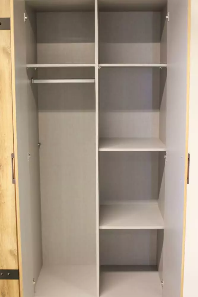 Industrial 2-ovinen vaatekaappi on nyt saatavilla edullisesti! Industrial 2-ovinen vaatekaappi on väriltään kaunis öljytty tammi, mitä korostavat kaapin mustan väriset yksityiskohdat, kuten vetimet. Vaatekaapissa on mukavasti säilytystilaa, joten siihen saa järjesteltyä hyvin vaatteita ja muita tavaroita. Kaapin vasemmalla puolella on vaatetanko, johon saa esimerkiksi henkareita roikkumaan, ja lisäksi vasemmalla puolella on ylähylly. Oikealla puolella kaapissa taas on hyllyjä ja ylähylly, joihin saa hienosti esimerkiksi vaatteita pinottua. Koska vaatekaapissa on kaksi umpinaista ovea, vaatteet pysyvät hyvin piilossa. Ulkoasultaankin Industrial vaatekaappi on todella tyylikäs, joten se on mukava sijoittaa kotiin. Tällä kaapilla vaatteiden säilytysongelmat ratkeavat varmasti. Tilaa siis Industrial 2-ovinen vaatekaappi edullisesti verkkokaupastamme, ja me toimitamme sen jopa 2 päivässä! Tekniset tiedot: Väri: öljytty tammi Sisällä vasemmalla puolella vaatetanko ja ylähylly Sisällä oikella puolella 2 kpl hyllyjä ja ylähylly Saranaovet Valmistettu kalustelevystä Valmistettu Saksassa Toimitetaan osina paketissa Helppo kasata Vaatekaappiin saatavana myös lisähyllyjä. Kummallekin puolelle sopii tämän lisähyllyn kapeampi versio. Vaatekaapin mitat: Leveys 90 cm, syvyys 58 cm ja korkeus 199 cm