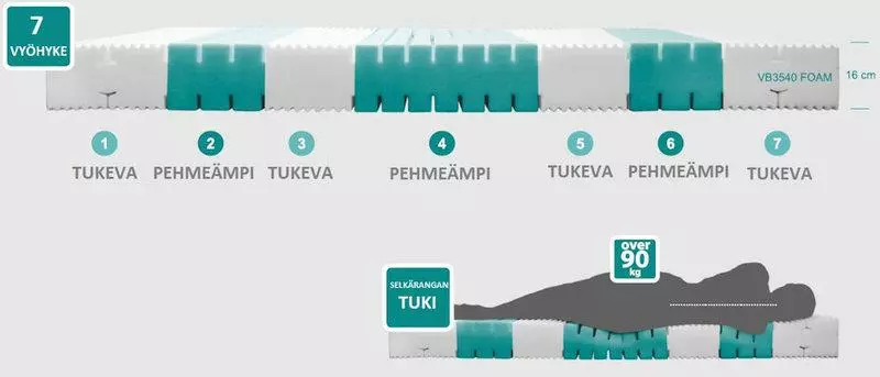 Laila kimmovaahtopatja on tukeva 7-vyöhykkeinen patja, joka soveltuu myös yli 90 kiloiselle nukkujalle! Laila kimmovaahtopatja tukee vartaloa juuri oikeista kohdista. Pehmeimmät kohdat löytyvät lantion, olkapäiden ja polvien alueelta, jolloin ne pääsevät painumaan sopivasti makuuasennossa ollessa ja selkäranka pysyy suorana. Muissa kohdissa vartaloa on patjaan valittu hieman kovempaa vaahtomuovia, jotta vartalon kevyimmät kohdat saavat riittävästi tukea ja nukkuma-asento on optimaalisempi. Sisuksena patjassa on VB3540-erikoisvaahtomuovi, joka on normaalia vaahtomuovia kantavampi, kimmoisampi ja kestävämpi materiaali. Tämän vuoksi Laila kimmovaahtopatja sopii erinomaisesti myös yli 90-kiloisille nukkujille tai muuten jämäkästä patjasta pitäville. Tekniset tiedot: Verhoiltu laadukkaalla Stretch-joustokankaalla VB3540-erikoisvaahtomuovi, joka on muita vaahtomuoveja kestävämpi, kimmoisampi ja kantavampi 7 vyöhykettä, joista kolme pehmeämpää ja neljä kovempaa Sopii myös yli 90-kiloisille Päälliskangas vesipestävä ja 100 % polyesteriä Patja on vyöhykkeiltään symmetrinen, joten sen pää- ja jalkapuolta voi vaihtaa Sopii myös allergikoille Jäykkyys: Todella kova kimmovaahtopatja, joka sopii erityisesti kovan patjan ystäville. Ominaisuuksiensa vuoksi patjaa voidaan suositella myös yli 90 kiloa painaville nukkujille. Mitat: Korkeus: 16 cm Patjakoko: 80 x 200 cm, 90 x 200 cm, 120 x 200 cm Huom! Kokoa 80×200 cm saapuu varastoon helmikuussa! Laatu: Laila kimmovaahtopatja on erittäin kestävä ja laadukas vaihtoehto kovan patjan etsijöille. Patjassa käytetty vaahtomuovi on tavallista kimmoisampaa, kantavampaa ja kestävämpää, joten patja on myös pitkäikäisempi kuin monet muut.