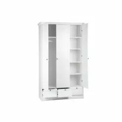 Maalaisromanttiset ja tilavat vaatekaapit edullisesti Tuppu-Kalusteelta! Kun tahdot kauniin ja tilavan maalaisromanttisen vaatekaapin saranaovilla, on 3-ovinen Lan vaatekaappi erinomainen valinta. Kahden vasemman puoleisen oven takaa löytyy pitkä henkaritanko ja tämän yläpuolella hylly, kun taas kapealla puolella on ainoastaan hyllylevyjä. Tämän lisäksi jokaisen kaapin alapuolella on vielä säilytyslaatikko esimerkiksi pienempien vaatteiden tai esineiden säilyttämistä varten. Väriltään Lan vaatekaappi on klassisen valkoinen ja muotoilultaan kauniin pelkistetty pienin maalaisromanttisin vivahtein, joita tuovat vaatekaapin yläosassa oleva koristesokkeli ja pienet sirot vetimet. Tilaa nyt edullinen ja säilytystilaltaan tilava Lan 3-ovinen vaatekaappi edulliseen tarjoushintaan verkkokaupastamme, ja kotiinkuljetamme sen jopa 2 päivässä! Tekniset tiedot: Väri: valkoinen Saranaovet Valmistettu kalustelevystä Kahden vasemman puoleisen oven takana henkaritanko ja ylähylly. Oikean puoleisimman oven takana hyllylevyjä Laatikoissa metallikiskot 2kpl mallikaappeja kasattuina jäljellä! Vaatekaapin mitat: Vaatekaapin mitat: leveys 120 cm, syvyys 51 cm ja korkeus 200 cm