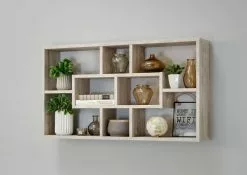 Lasse seinähyllyssä on helppo ja hieno säilyttää kodin tavaroita! Lasse seinähylly on kaunis ja monipuolinen hylly, joka tuo kotiin lisää näyttävyyttä. Kooltaan seinähylly on sopivan siro, mutta silti siihen mahtuu hyvin säilömään erilaisia tavaroita. Lasse seinähyllyssä onkin erikokoisia lokeroita, joihin saa hyvin erilaisia pieniä esineitä näytille ja säilöön. Erityisen hyvältä hyllyssä näyttävät esimerkiksi pienet kasvit, astiat ja koriste-esineet. Tyyliltään seinähylly on näyttävän moderni ja sen erilaiset lokerot tekevät hyllystä varmasti ainutlaatuisen. Lasse seinähyllyn valmistusmateriaalina on käytetty melamiinipinnoitteista kalustelevyä, joka on helppo pitää puhtaana. Värinä hyllyssä on tyylikäs sand oak, jonka ansiosta seinähylly on myös kauniin luonnollisen näköinen. Tilaa tämä tyylikäs Lasse seinähylly edulliseen hintaan nyt verkkokaupastamme! Tekniset tiedot: Väri: sand oak Valmistettu melamiinipinnoitetusta kalustelevystä Sisältää seinäkiinnikkeet Toimitetaan osina Seinähyllyn mitat: Leveys 85 cm, korkeus 47,5 cm ja syvyys 15,5 cm Lasse seinähyllyn kasausohje