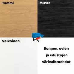 | Rungon ja oven väri | Valkoinen runko ja valkoinen ovi, Valkoinen runko ja musta ovi, Valkoinen runko ja tammi ovi, Tammi runko ja tammi ovi, Tammi runko ja valkoinen ovi, Tammi runko ja musta ovi, Musta runko ja musta ovi, Musta runko ja valkoinen ovi, Musta runko ja tammi ovi |