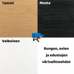 | Rungon ja oven väri | Valkoinen runko ja valkoinen ovi, Valkoinen runko ja musta ovi, Valkoinen runko ja tammi ovi, Tammi runko ja tammi ovi, Tammi runko ja musta ovi, Tammi runko ja valkoinen ovi, Musta runko ja musta ovi, Musta runko ja valkoinen ovi, Musta runko ja tammi ovi |