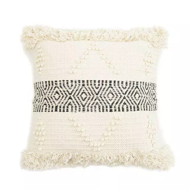 Lumo koristetyynyssä on pinnassa ihanat ja boheemit hapsut! Lumo koristetyynyssä on lyhyet hapsut reunoissa, pienet pampulat pinnassa ja tyylikäs tumma kuviointi keskellä. Koristetyyny sopii hienosti esimerkiksi koteihin, joissa pidetään boheemista sisustustyylistä. Lumo koristetyynyä voi helposti yhdistellä muiden Lumo koristetyynyjen kanssa, jolloin kotiin saadaan upea yhdistelmä boheemeja tyynyjä. Koristetyynyjä voi sijoittaa muun muassa sängyn tai sohvan päälle mukavuutta ja näyttävyyttä tuomaan. Tilaa kaunis Lumo koristetyyny verkkokaupastamme edullisella hinnalla ja toimituksella! Tekniset tiedot: Väri: luonnonvalkoinen/harmaa Päällinen 100% puuvillaa Hinta sisältää vanutäytteisen tyynyn ja vetoketjullisen tyynynpäällisen Koristetyynyn mitat: 50 x 50 cm
