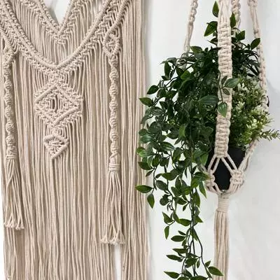 Makrame 50×100 toimii näyttävänä katseenvangitsijana seinällä! Luonnonvalkoinen Makrame seinävaate tuo boheemia ilmettä sisustukseen. Makrame seinävaatteen voi sijoittaa makuuhuoneeseen sängyn päätyyn tai olohuoneeseen näkyvälle paikalle. Makramessa on valmiiksi kiinnitysnaru seinälle ripustamista varten, minkä ansiosta esillelaitto on helppoa ja vaivatonta. Tuo luonnonläheisyyttä ja boheemia ilmettä tällä upealla Makrame seinävaatteella sisustukseen edullisesti. Tekniset tiedot: Väri: luonnonvalkoinen Materiaali: 100 % puuvilla Tanko luonnonväristä puuta Makrame seinätaskun mitat: 50 x 100 cm