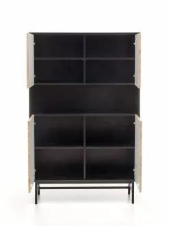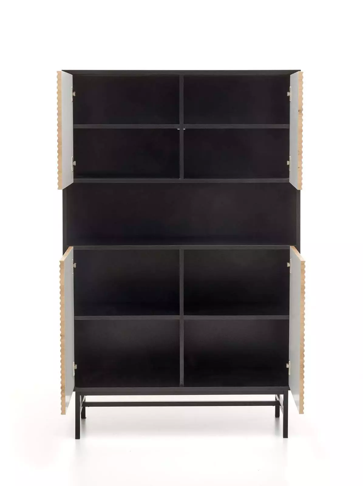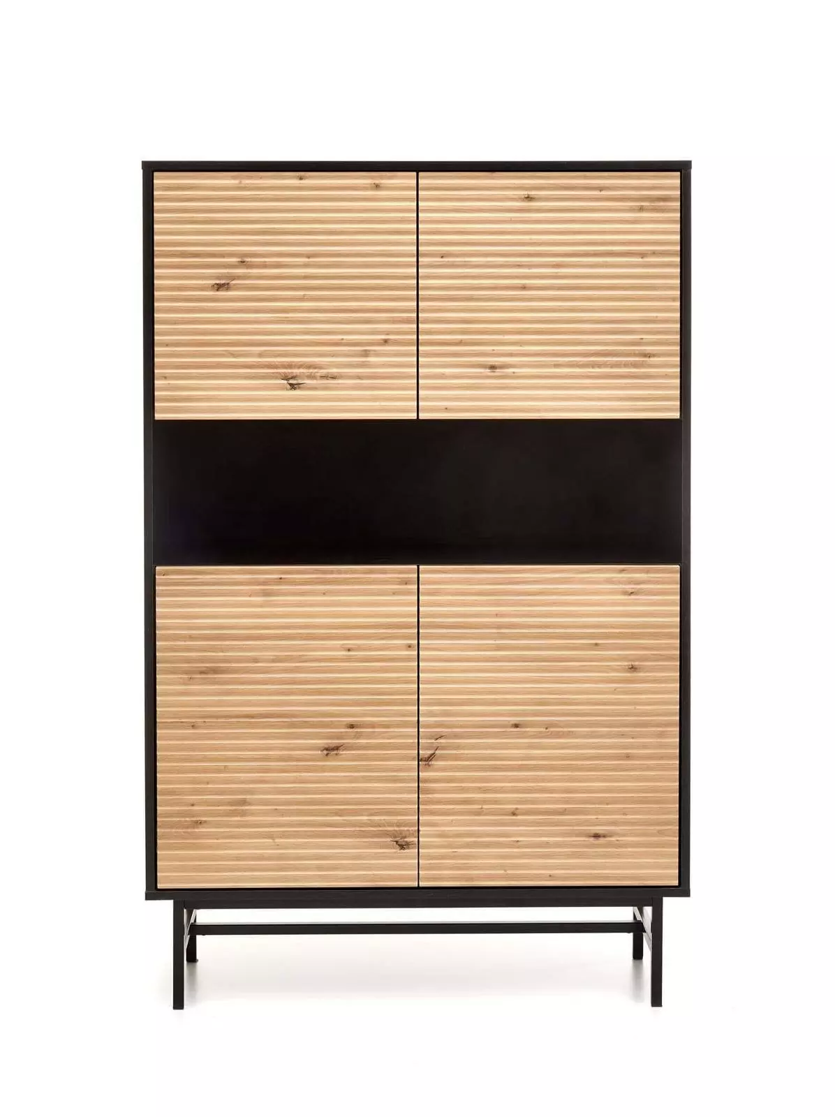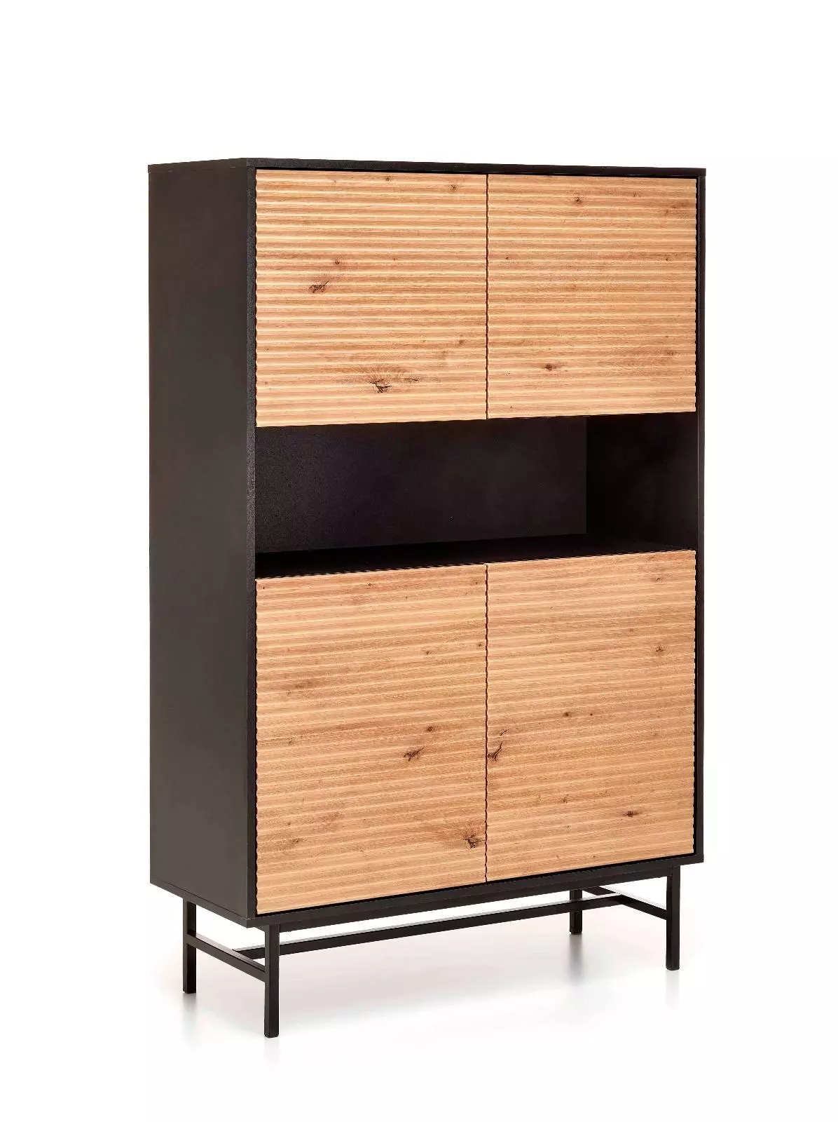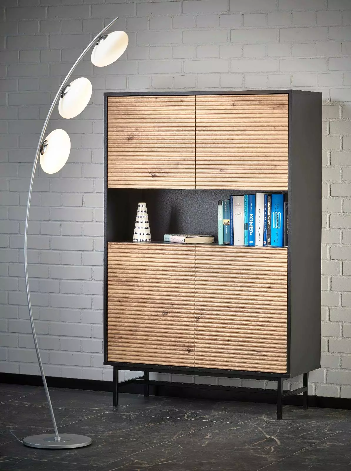 Erittäin tyylikkääs Murano kaappi sopii niin olohuoneeseen, keittiöön kuin toimistoon! Tammen värinen uritettu etuosa tuo luonnollista ilmettä upeaan Murano kaappiin, joka toimii upeana katseenvangitsijana tilassa. Murano kaapin voi yhdistää esimerkiksi boheemiin, skandinaaviseen tai moderniin sisustustyyliin. Korkeat mustat metallijalat tuovat ilmavuutta ja ripauksen teollista ilmettä. Muranossa on neljä kaappia, joiden sisällä on yksi välihylly jakamassa tilan. Kaapin keskellä on yksi leveä avohylly, johon voi asetella esille esimerkiksi kirjoja, koriste-esineitä tai astioita. Murano tuotesarjasta löytyy muitakin kalusteita, joilla voit luoda yhtenäisen kokonaisuuden tilaan. Hanki näyttävä Murano kaappi nyt edullisesti ja nopealla toimituksella! Tekniset tiedot: Väri: tammi/musta Materiaali: laminoitu mdf, laminoitu lastulevy, pulverimaalattu teräs Neljä kaappia välihyllyillä, lisäksi yksi leveä avohylly Uritettu etuosa Toimitetaan osina Kaapin mitat: Kaapin mitat: leveys 100 cm, syvyys 40 cm ja korkeus 156 cm Paino 60 kg