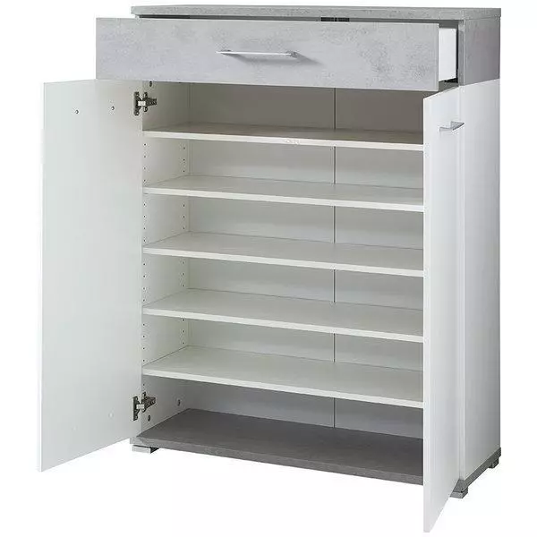 Topix kenkäkaapissa on reilusti säilytystilaa! Tyylikäs Topix kenkäkaappi on upean valkoisen/harmaan värinen laadukkaasta kalustelevystä valmistettu kenkäkaappi, jossa on säilytystilaa noin kahdellekymmenelle parille kenkiä eli säilytystilaa kenkäkaapissa on reilusti. Topix kenkäkaapissa on yksi leveä laatikko ja kaksi ovellista kaappia, joiden takana on viisi korkeussäädettävää hyllyä. Käytännöllistä Topix kenkäkaapissa on se, että kaappien ovissa on hidastusmekanismit, joten perheen pienimpienkään sormet eivät jää ovien väliin. Tilaa edullinen Topix kenkäkaappi nyt verkkokaupastamme! Tekniset tiedot: Väri: valkoinen/harmaa Materiaali kalustelevyä Yksi leveä laatikko Kaksi ovellista kaappia, joiden takana 5 korkeussäädettävää hyllyä Kenkäpenkkiin mahtuu noin 20 paria kenkiä Kaappien ovissa hidastusmekanismit Hartsipinta takaa kestävyyden Vetimet ja jalat metallia Toimitetaan osina Kenkäpenkin mitat: Leveys 89 cm, syvyys 36 cm ja korkeus 118 cm Topix kasausohjeet ja kantavuustiedot